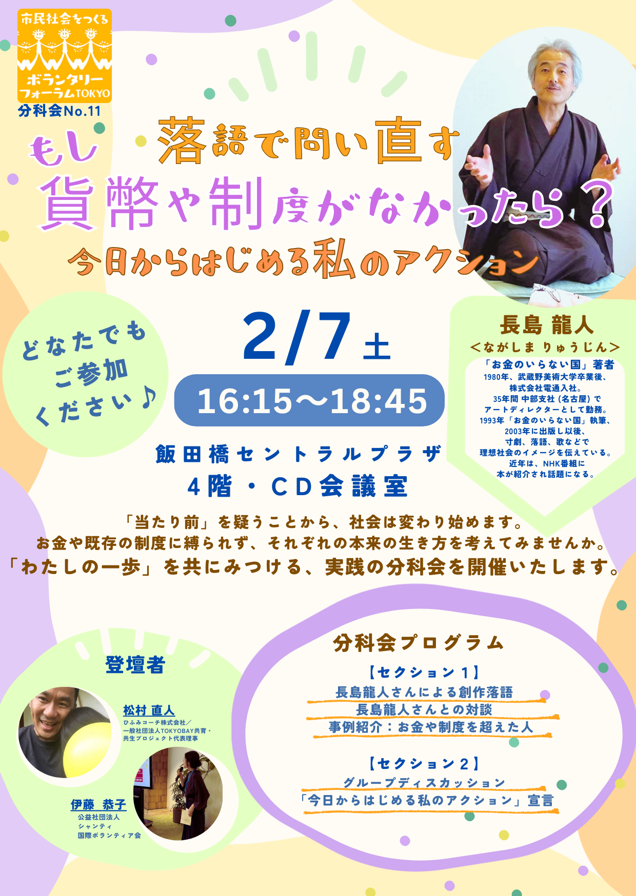 本分科会では、「お金のいらない国」の著者・長島龍人氏による創作落語で既成概念を揺さぶり、実際にお金や制度を超えて生きる人々の事例を紹介します。グループ対話を通じて参加者同士で気づきを深め、最後は一人ひとりが「私のアクション」を宣言。明日から実践できる一歩を見つける分科会です。