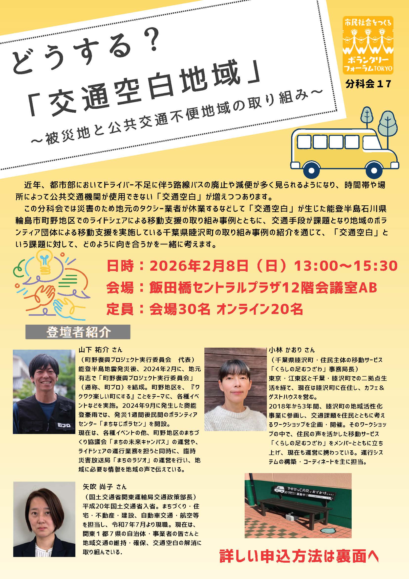 能登半島輪島市では、災害のため公共交通機関が使用できない「交通空白」が生じ、そういった状況を解消するため、令和7年7月からライドシェアの実証実験が始まっています。一方、都市部においては路線バスの廃止・減便が進み、公共交通不便地域が増えつつあります。そこで輪島市及び地域ボランティア団体により移動支援を運営している千葉県睦沢町の取り組み事例を通じて「交通空白」にどう向き合えば良いかを考えます。