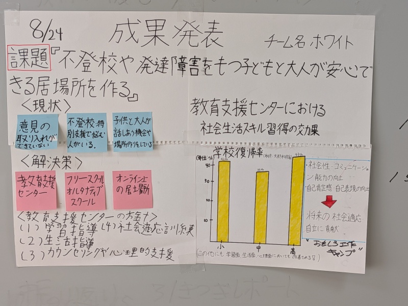 仕事そしてまちで活動する大人の動画を視聴して、まちの問題を発見して課題解決を行い成果発表を行う。探究型のワークショップです。