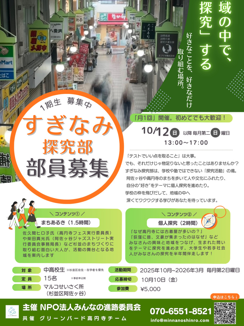 今年、たかまつ探究部(香川県高松市)を4月にスタートさせたNPO法人みんなの進路委員会が、10月よりすぎなみ探究部(東京都杉並区)を開始させます
