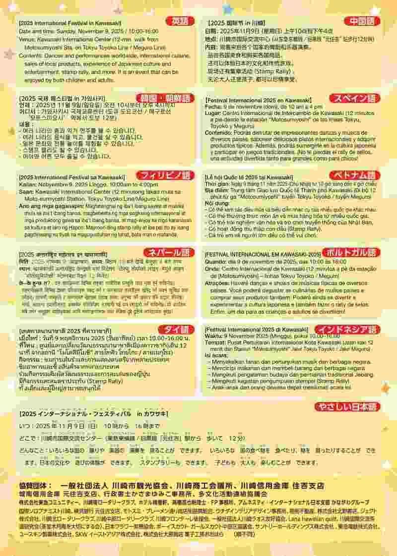川崎市国際交流センターで、さまざまな国・地域の文化を体験できるイベントです。日本人も外国人も一緒にフェスティバルを盛り上げます。