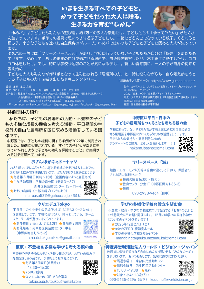 映画「ゆめパのじかん」は、川崎市に子ども権利条例ができたときに、それを具現化するためにできた子どもの居場所「川崎市子ども夢パーク」のドキュメンタリー映画です。