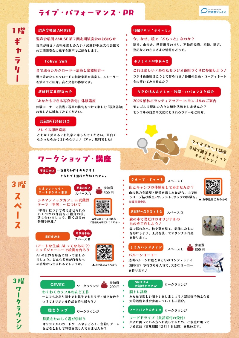 武蔵野プレイスに登録している市民活動団体のワークショップやライブを館内各所で開催し、団体に関するクイズラリーやお祭りブースもお楽しみいただけます !