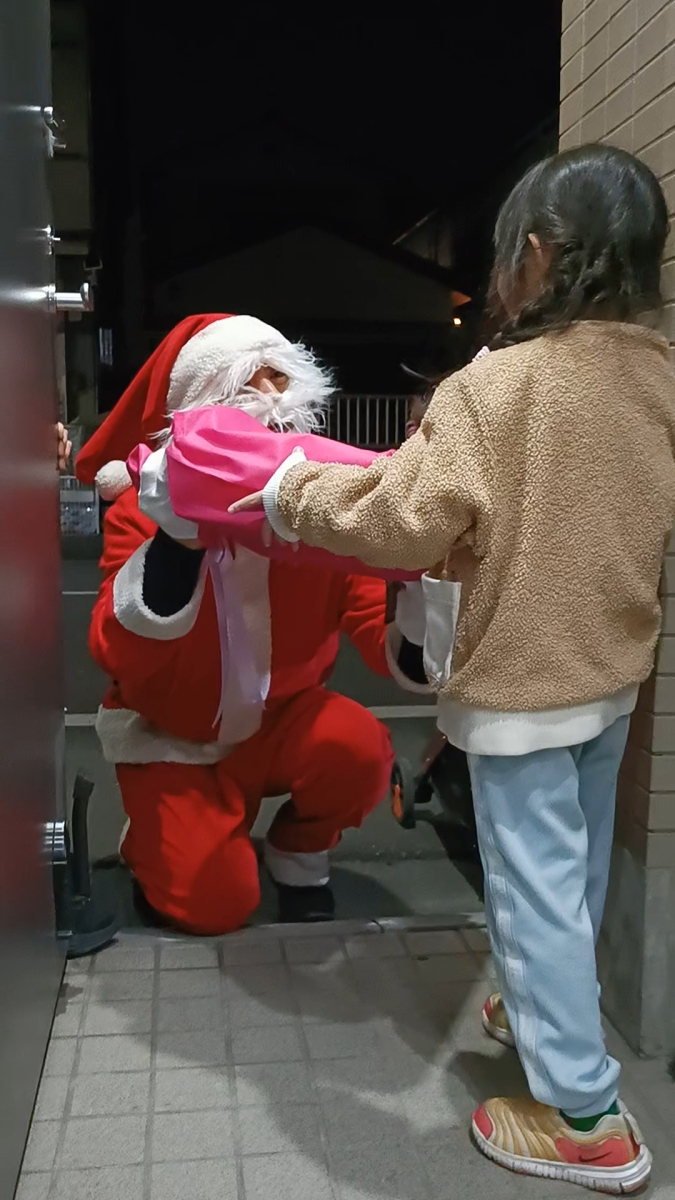 クリスマスイブの夜、サンタクロースに扮し応募があったご家庭を訪問し、