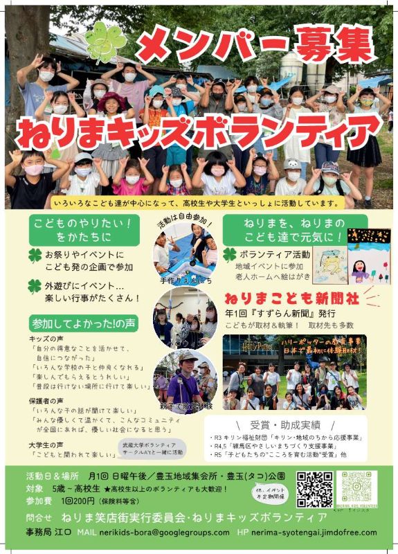 「子どものやりたいことを実現する!」をモットーに、子ども主体で、地域のお祭りにお店を出したり、様々なボランティアをしたり、レクや外遊び、企画・取材・記事作り・配達まで子どもが行う、こども新聞を発行しています。子どもや親子での参加や、子どもたちと一緒に活動してくれるボランティアスタッフを募集しています。