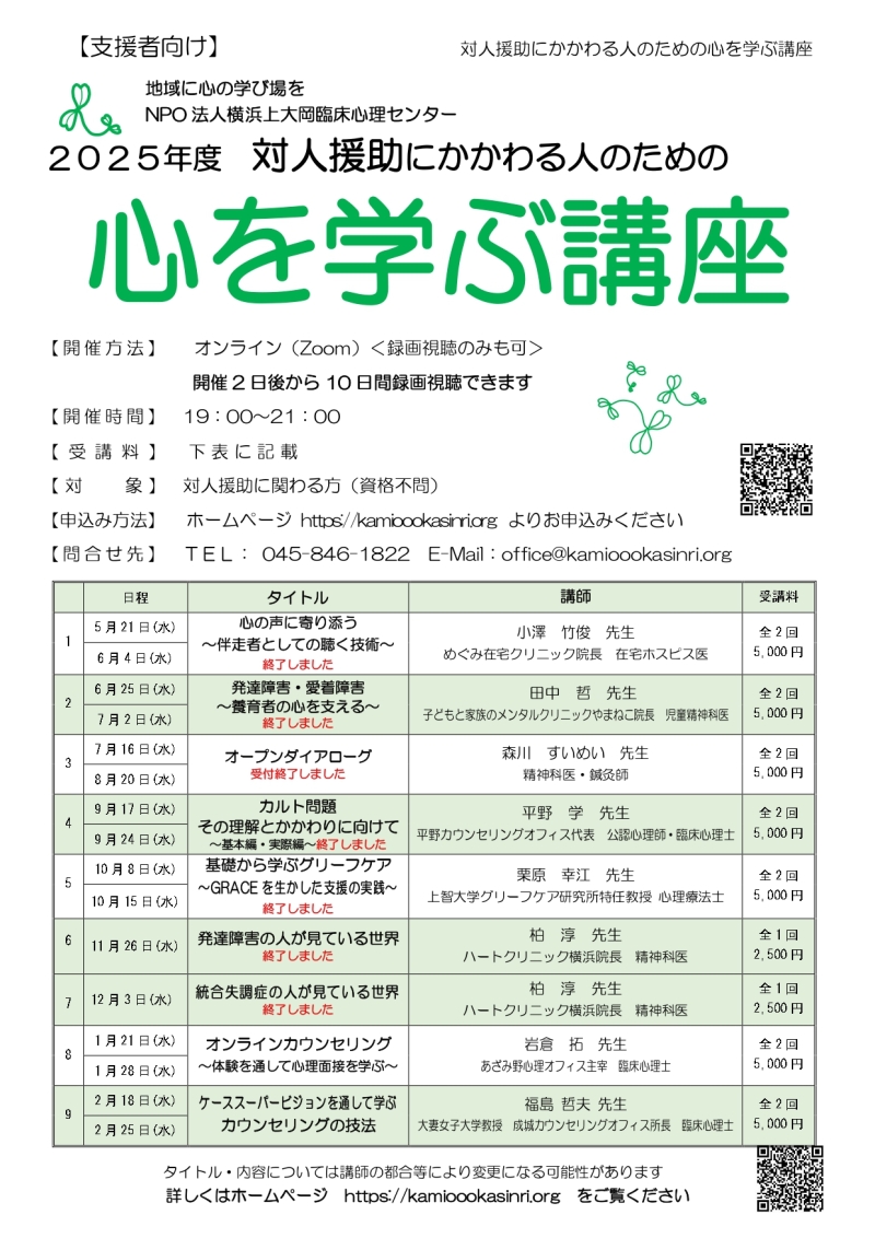 という方に参加していただきたい講座です。ともに、これからの「こころの支援」の形を探っていきましょう。クライエント役への立候補も歓迎いたします。