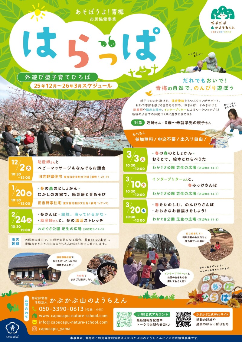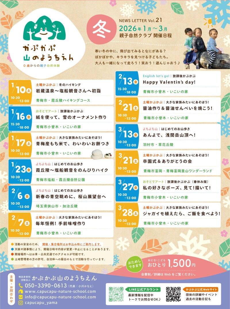 かぷかぷ山のようちえんでは、「たのしいをつくるちからはやまで育つ」をテーマに、0歳から親子で参加できる自然体験活動を2017年から行っています。その中で、親一人できょうだい児、双子を連れて参加する方が増えてきたため、一緒に活動しながら、子どもたちの見守りを手伝っていただけるボランティアを募集します。きょうだい一緒に自然とともに遊びたいけど、おとな一人ではちょっと不安。そんな親子をあたたかくサポートしていただけませんか?親と子の気持ちによりそって、もうひとりの家族、親戚のおにいさんおねえさん、おじいちゃんおばあちゃんのように、こどもたちのたのしい!をつくる気持ちを大事に、あたたかく見守っていただけたら嬉しいです。子どもに関わる勉強をしている学生さん、自然の中での活動が好きな方、保育や親子の活動に興味のある方など、年齢や経験を問わず、ご応募をお待ちしています。