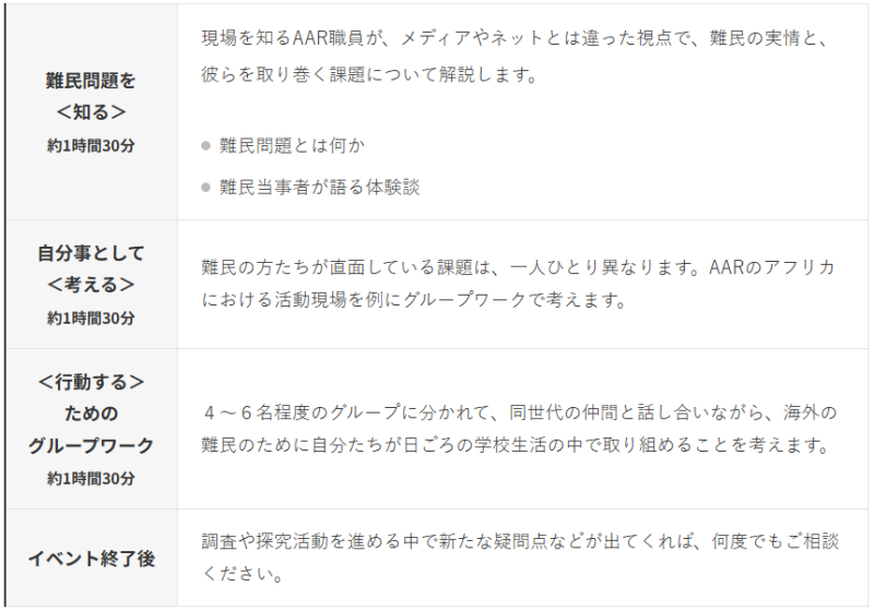 世界の難民は今や約1億2,300万人に達し、危機的な状況にあります。本イベントでは現場を知るAAR Japan難民を助ける会 のスタッフによる解説やグループワークを通して、海外の難民の現状を知り、高校生の皆さんが自分たちに何ができるかを考えます。