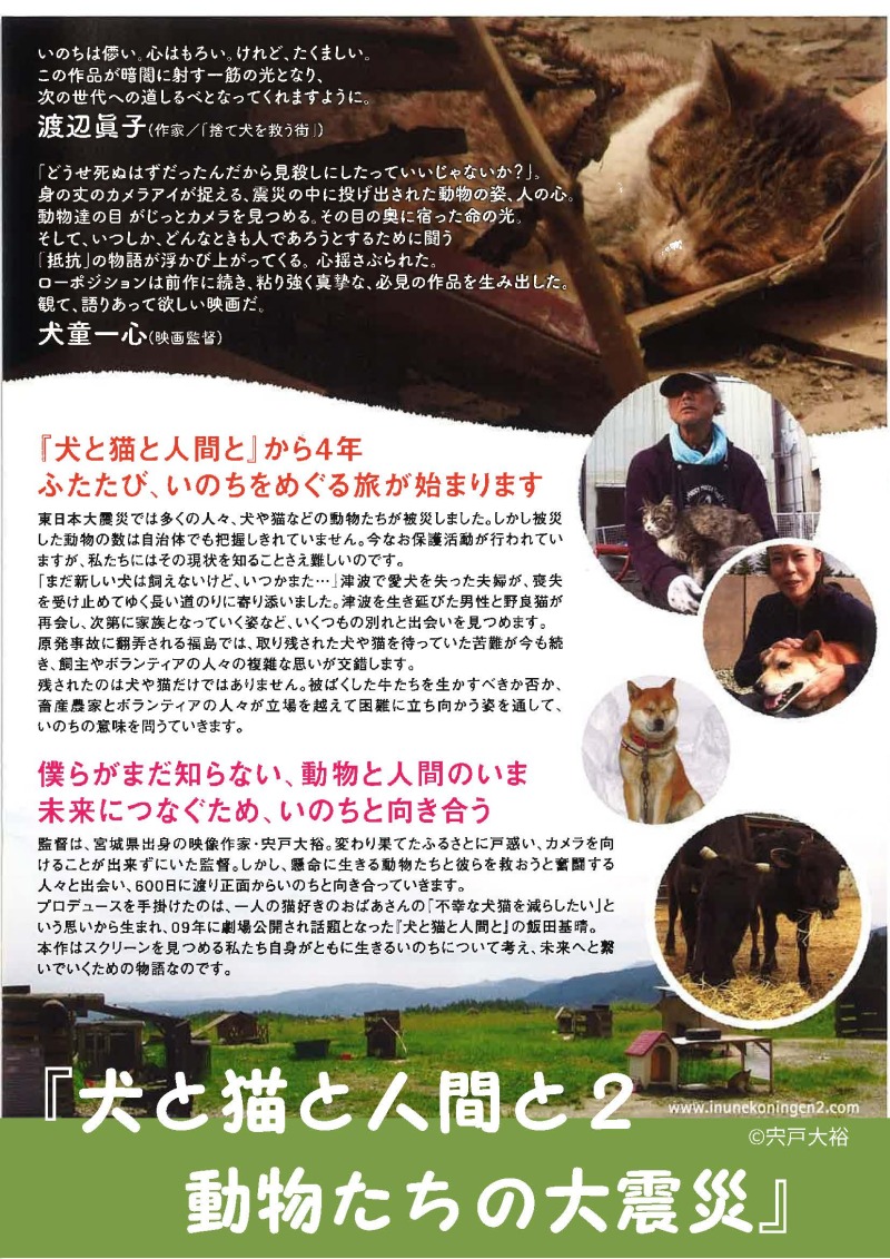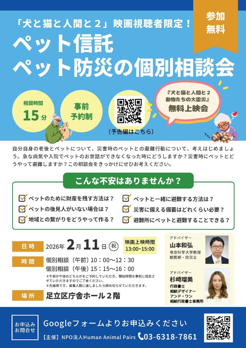 2026年2月11日(水祝)、足立区庁舎ホールにて『犬と猫と人間と2 動物たちの大震災』の映画上映会(先着順、無料)を行います。日頃の防災対策を見直すきっかけになれば嬉しいです!!