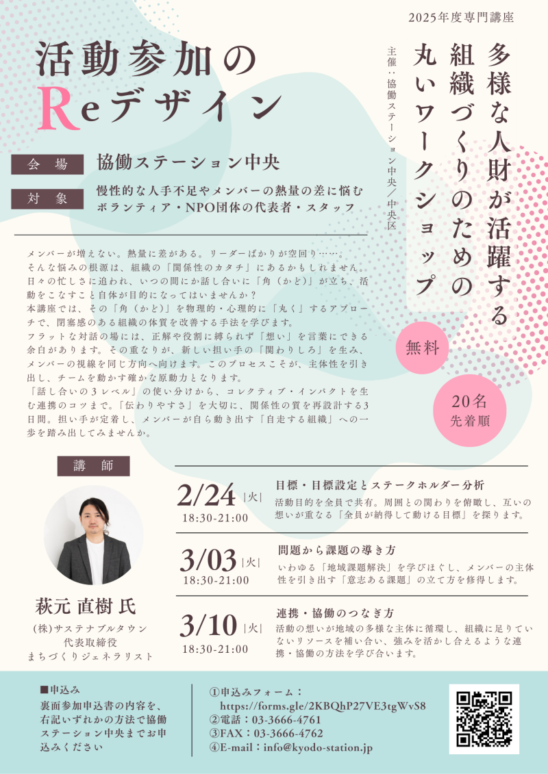 (2)(3)で申込む際は、氏名(ふりがな)・所属・活動地域(中央区全域,、日本橋地域、京橋地域、月島地域、区外、その他)・連絡先(TEL、FAX、E-mail)、参加動機、団体運営や連携・協働にに関する悩みをお知らせ下さい。