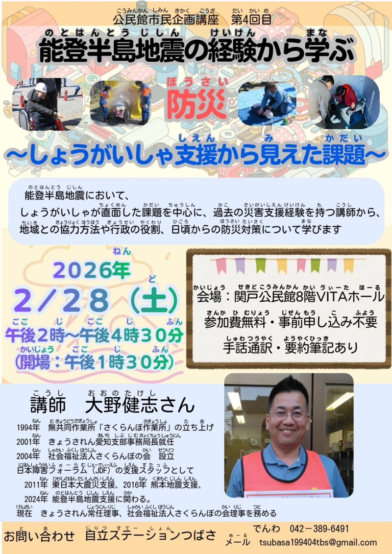 能登半島地震において、しょうがいしゃが直面した課題を中心に、過去の災害支援経験を持つ講師から地域との協力方法や、行政の役割、日ごろからの防災対策について学びます!