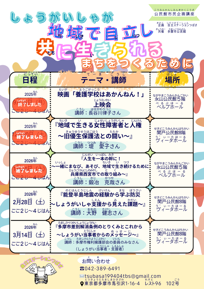 しょうがいしゃが暮らしやすいバリアフリーな多摩市をめざすことは、だれもが病気やけがをしたときに住みやすい社会になるはずです。そんな社会にしていくために、何ができるか一緒に考えましょう!