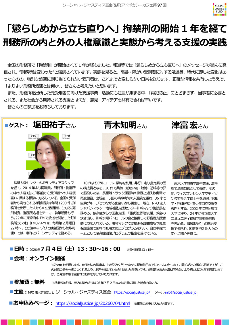 『「懲らしめから立ち直りへ」~拘禁刑の開始1年を経て~刑務所の内と外の人権意識と実態から考える支援の実践』:SJFアドボカシーカフェ第97回