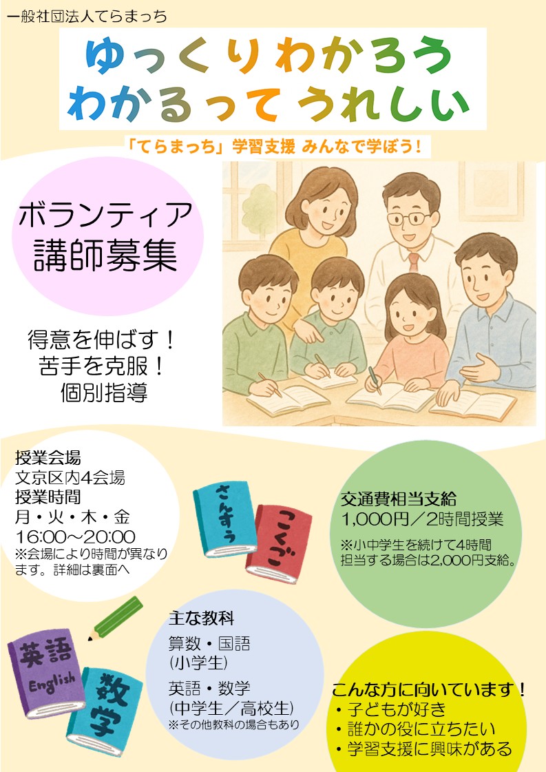 文京区で、小中高校生への学習支援を行うボランティアスタッフ、講師を募集中